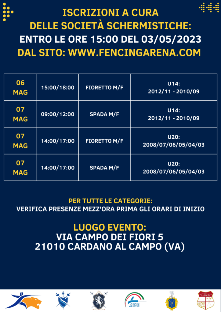 Iscrizioni a cura delle Società Schermistiche (NON da singoli tesserati) entro le ore 15:00 del 03/05/2023 o comunque al raggiungimento della capienza massima: